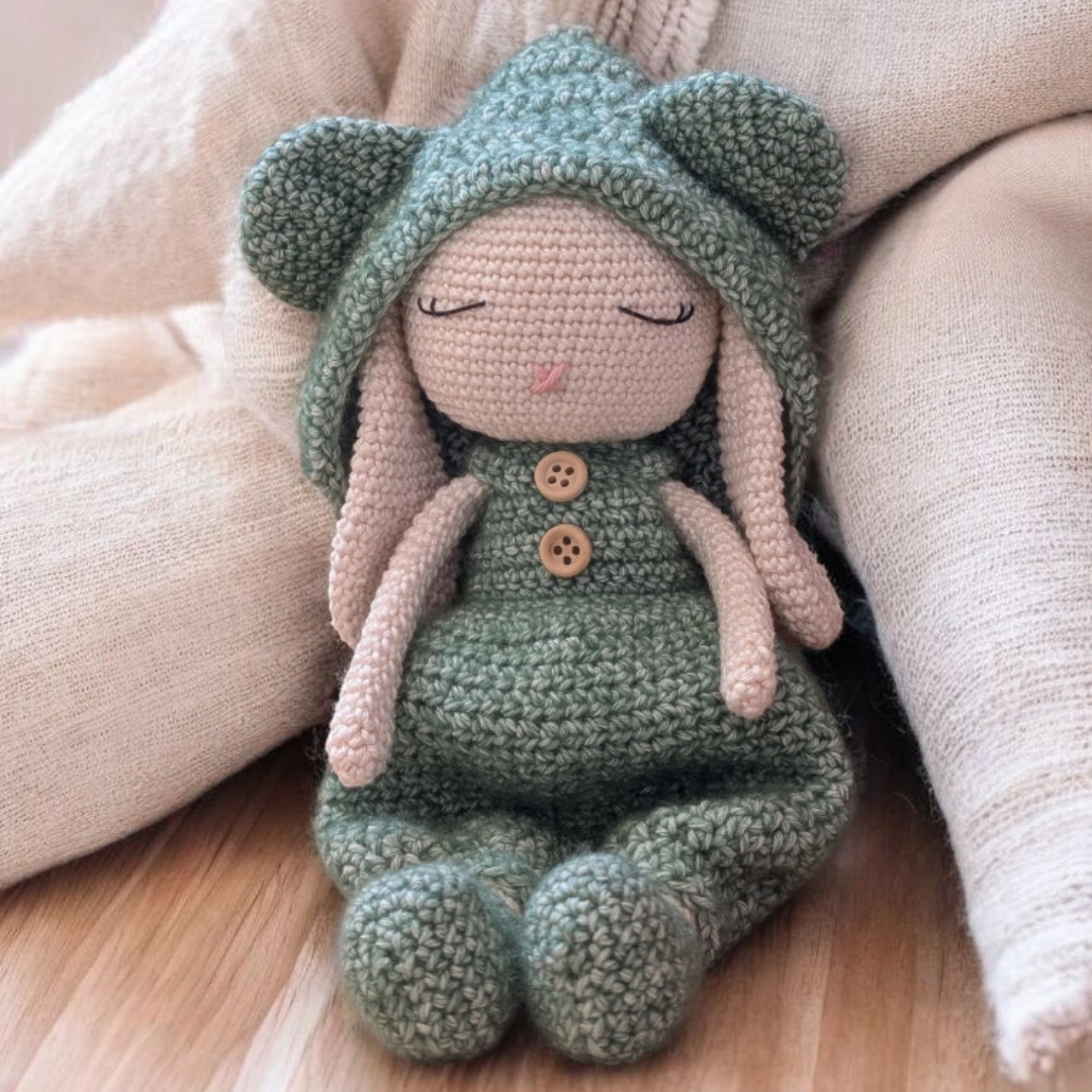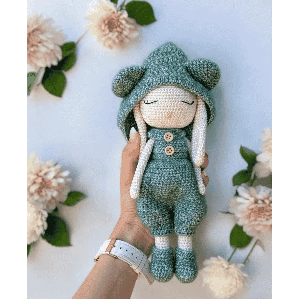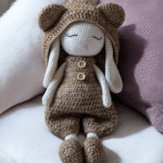 Blottie dans sa combinaison moelleuse et son bonnet à oreilles d’ours, Jane invite à la tendresse et à la rêverie. Facile à crocheter, ce modèle plein de douceur plaira à coup sûr.