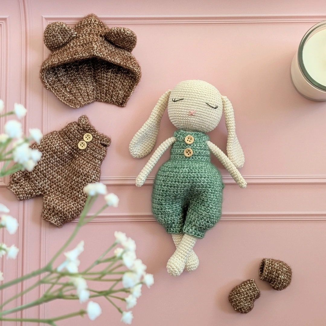 1 FICHIER NUMERIQUE au format PDF de 10 pages contenant les explications pour réaliser une lapine en combinaison, avec son bonnet et ses chaussons. (en français)