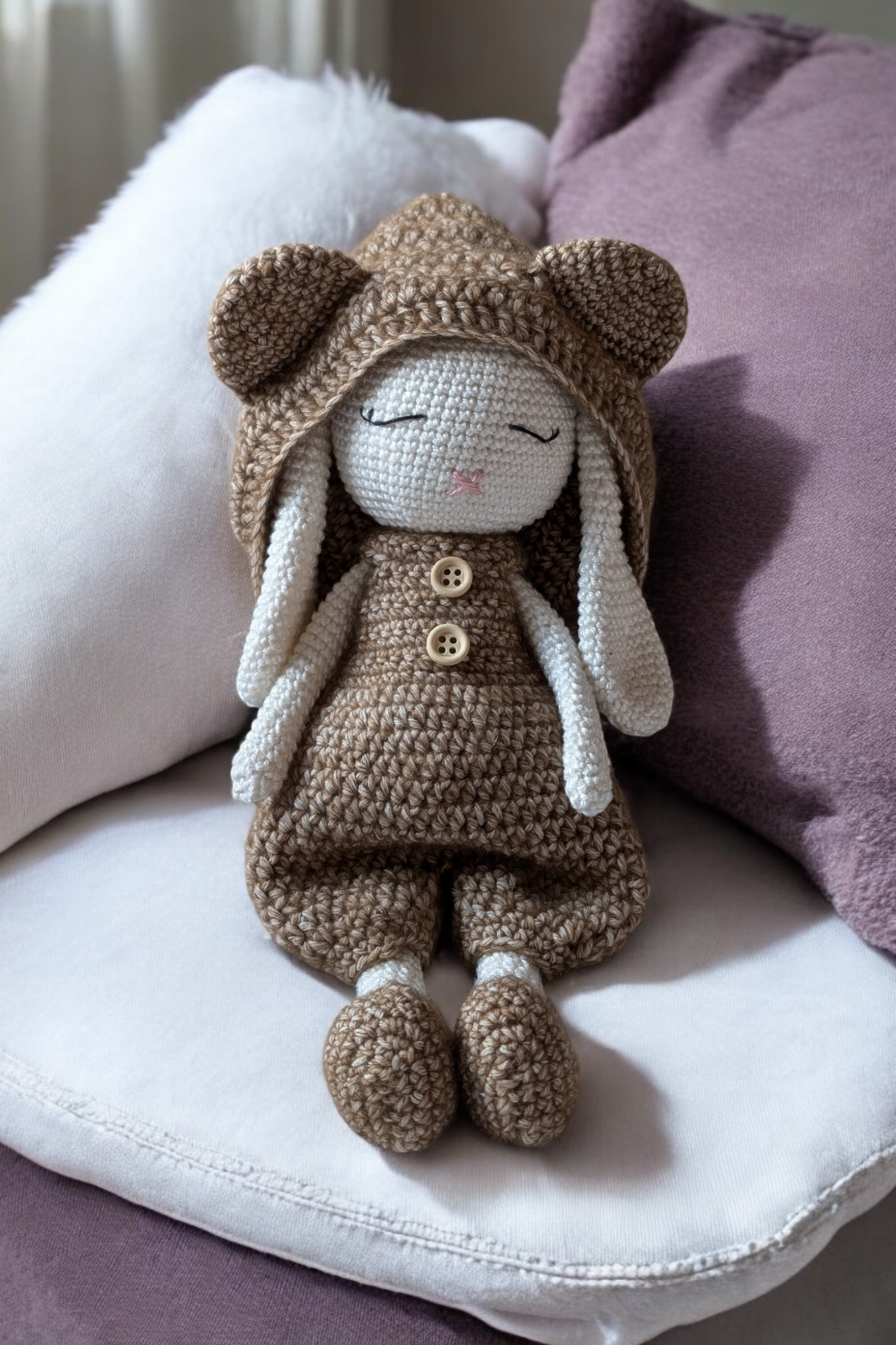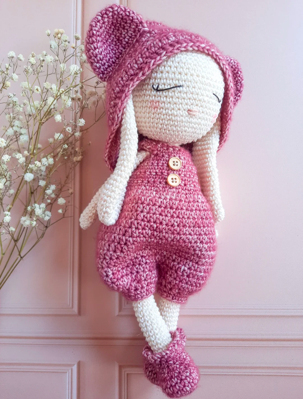 Crochetée en 2,5mm, la lapine mesure environ 28/30 cm. La taille peut varier selon votre façon de crocheter.